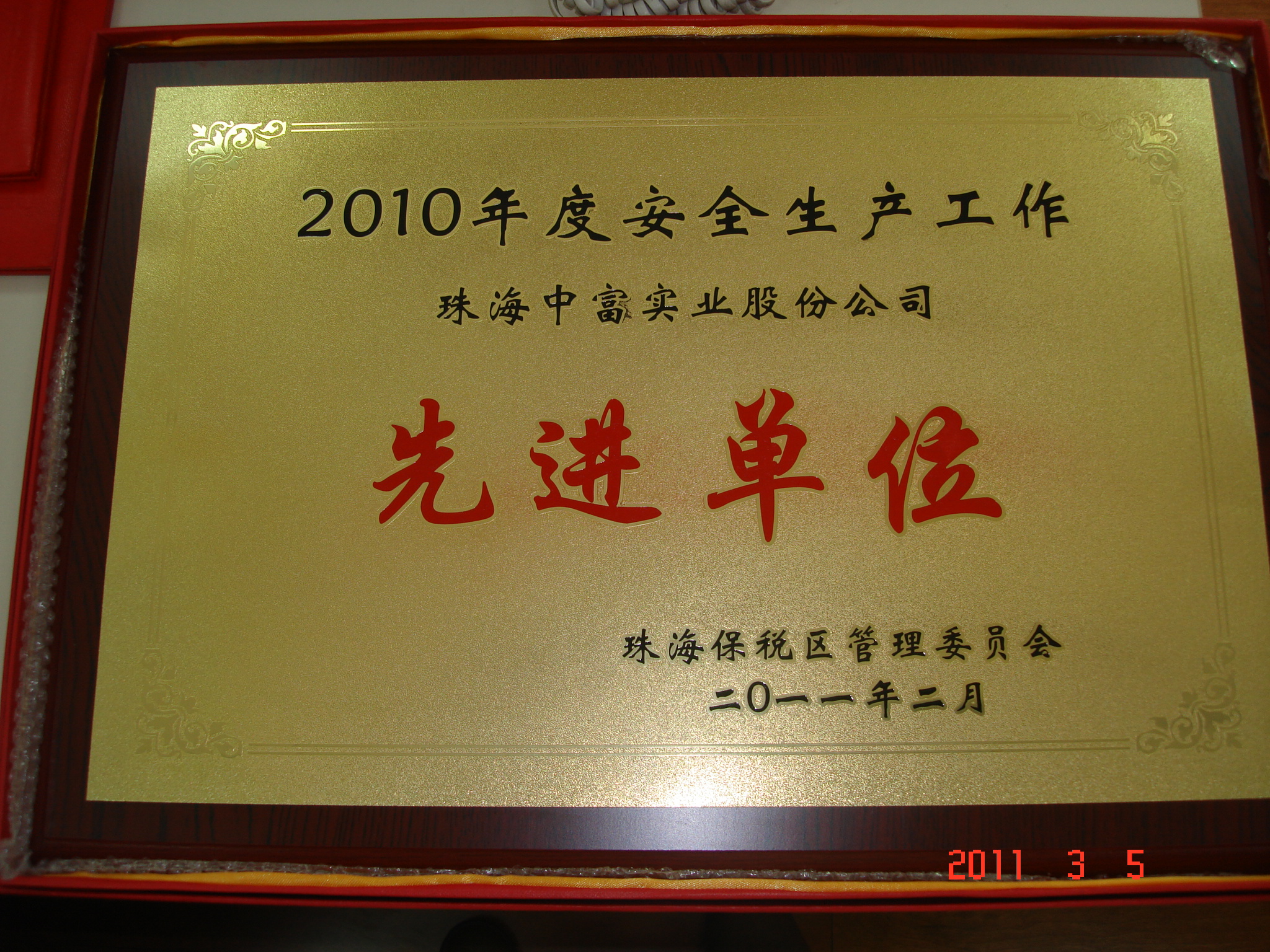 2011年剛邁入新的起點(diǎn),珠海中富喜訊不斷傳來(lái),先后被評(píng)為“2010年度經(jīng)濟(jì)工作先進(jìn)單位”和“2010年度安全生產(chǎn)工作先進(jìn)單位”。支持中心人事部的曾思明和張華芬同志也分別榮獲“珠海保稅區(qū)2010年度安全生產(chǎn)工作先進(jìn)個(gè)人”和“珠海保稅區(qū)2010年度勞動(dòng)保障監(jiān)察工作先進(jìn)個(gè)人”。
